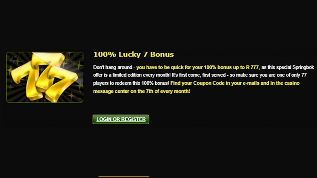 Next on the list we have the Lucky 7 Bonus, which is essentially the way Springbok Casino labels its email subscription rewards. Once you subscribe to the newsletter, you will start receiving secret Springbok Casino promo codes every week, granting you a 100% match bonus limited to R777.