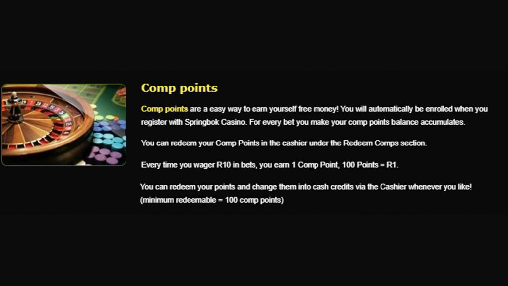 | Comp Points | Get 1 comp point for every R10 wagered | No code required | No deposit required | No wagering requirements |